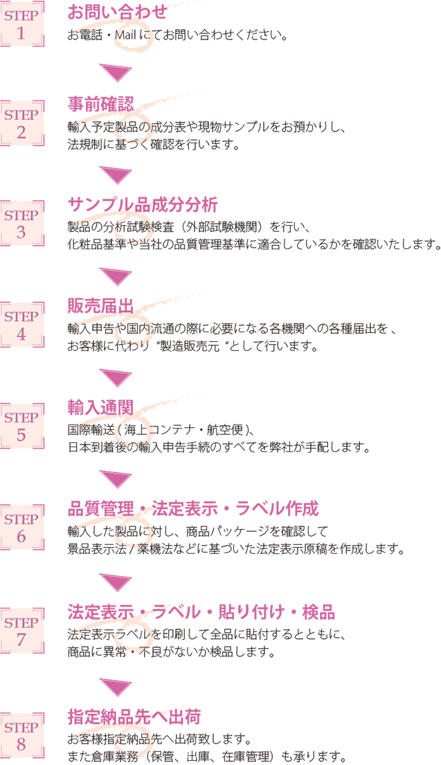 韓国コスメブランドは、キラ星のようにございますが、当社は選りすぐりのブランドと提携業務を行っています。お客様がご希望の韓国ブランド、または日本未発売の商品をぜひ販売してみたい。けれども、輸入の仕方、ブランドへのコンタクトが分からない。そんな時はお声掛けください。当社の韓国在住ビジネスパートナーが、ご希望の商品を揃え、当社がお客様のお手元にお届けします。